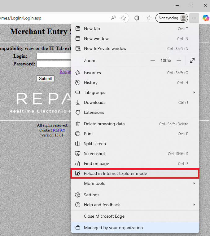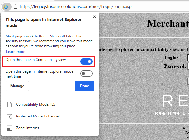 Repay Clearing and Settlement legacy systems including Merchant Entry System (MES), Holds and Reserves Entry (HREntry), and Holds and Reserves Management System (HRMS) require use of Microsoft Edge in Internet Explorer Mode and Compatibility view.